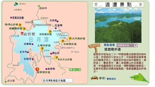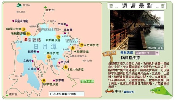 涵碧樓自然步道為蜿蜒於涵碧半島的森林小徑,步道全長約一‧五公里,階梯由古樸的紅磚砌成。清晨漫步其中,常見五色鳥、山紅頭、繡眼畫眉等鳥類活躍林間。行至潭畔碼頭,可盡覽慈恩塔、拉魯島及群山綠水美景。http://www.taiwan.net.tw/lan/Cht/attractions/scenic_spots.asp?id=2507